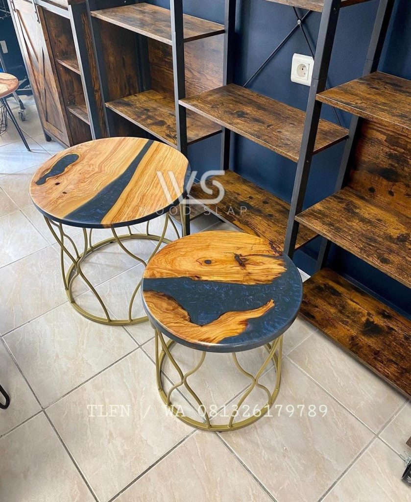 coffee table dengan bahan kayu trembesi yang di campur dengan resin epoxy dan dipadukan dengan kaki meja yang terbuat dari besi stainless membuat meja ini memiliki nilai estetik yang tinggi, tempatkan pada sudut ruangan atau pada teras sebagai pelengkap kursi teras.