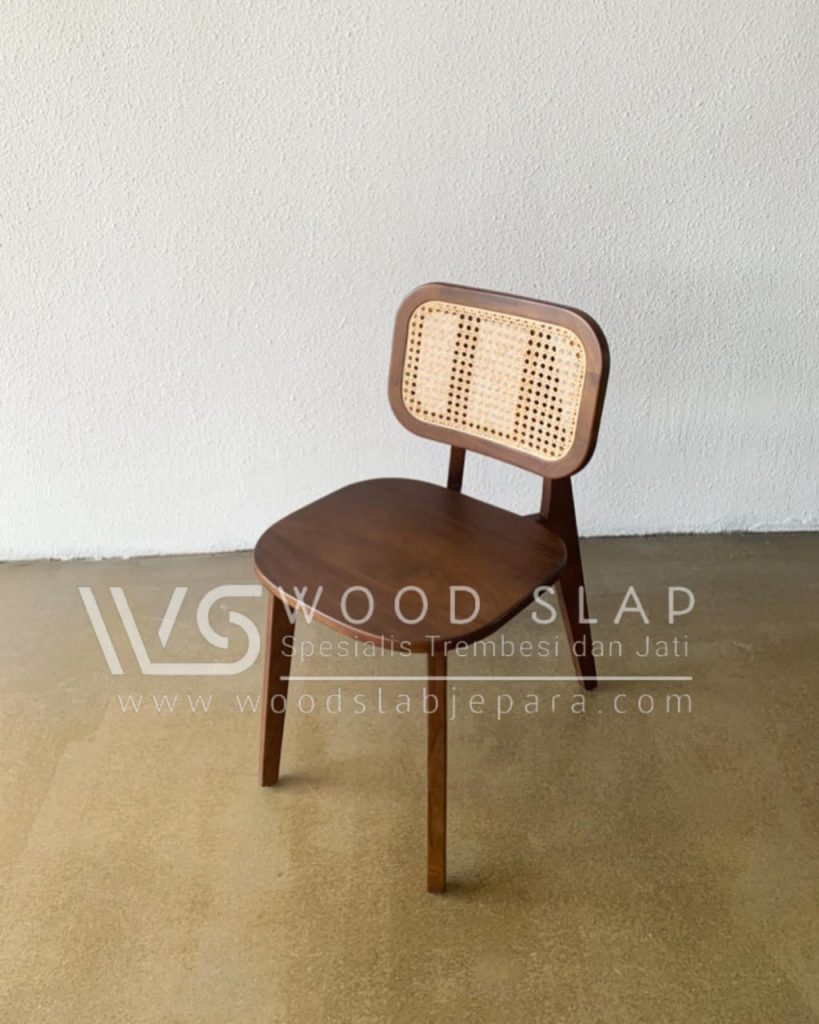 Sebuah kursi cafe yang terbuat dari bahan material kayu jati grade A dengan kontruksi purus yang kokoh serta penambahan rotan pada bagian sandaran membuat kursi ini sangat cocok untuk digunakan pada ruang makan, cafe, restoran atau teras rumah anda, dengan desain yang milimalist elegant membuat kursi ini cukup diminati di kalangan anak muda, kursi ini merupakan salah satu koleksi dari katalog WOOD SLAB Jepara.