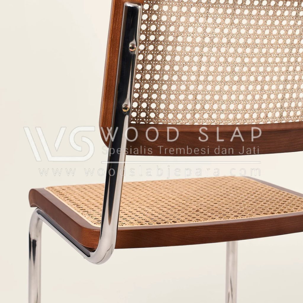 Sebuah kursi cafe yang terbuat dari bahan material besi stainless dan kayu jati grade A serta penambahan rotan pada bagiam sandaran dan dudukan membuat kursi ini sangat cocok untuk digunakan pada ruang makan, cafe, restoran atau teras rumah anda, dengan desain yang milimalist elegant membuat kursi ini cukup diminati di kalangan anak muda, kursi ini merupakan salah satu koleksi dari katalog WOOD SLAB Jepara.