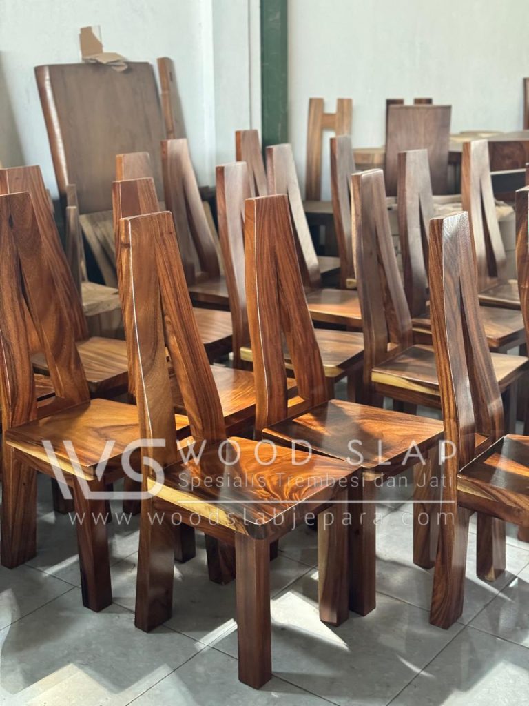 kursi makan dengan desain minimalis yang tegas, dengan bahan kayu trembesi solid dan sambungan kontuksi yang sangat kokoh, kursi ini sangat cocok untuk disandingkan dengan meja makan kami.