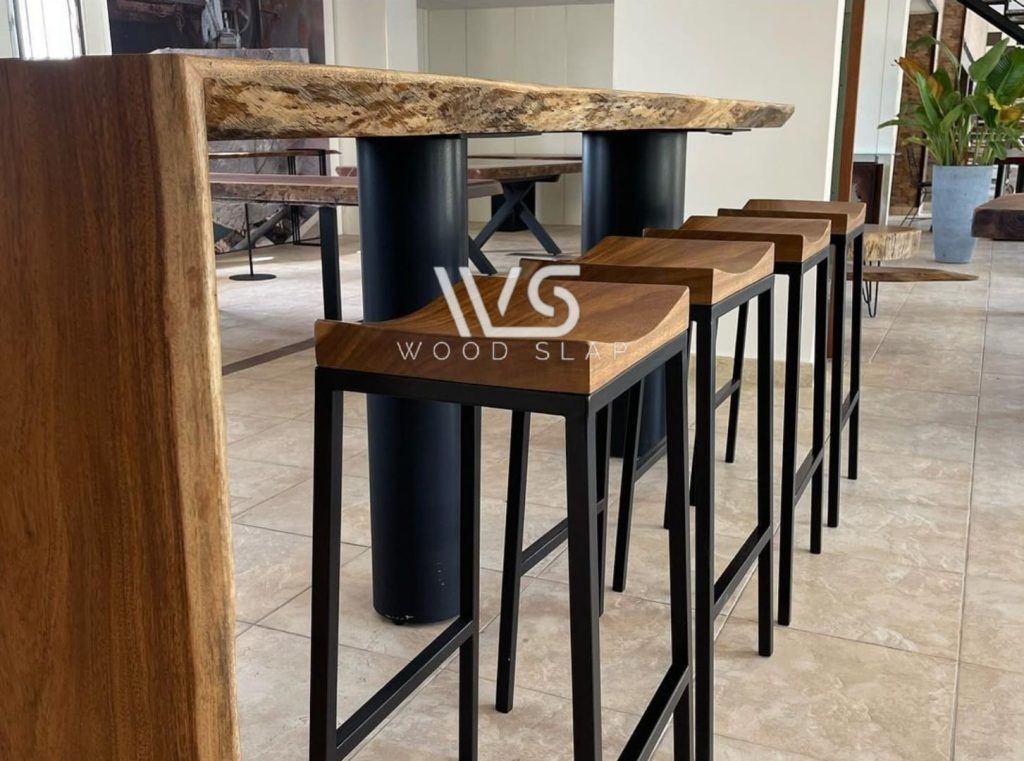 Dengan mengedapankan desain minimalis, meja bar kami menggunakan kayu trembesi solid yang di bentuk menyerupai huruf L dengan salah satu kaki meja yang menyambung langsung dengan daun meja, kemudian pada bagian tengah di sokong oleh besi galvanis pipa sehingga tidak usah takut jika patah.