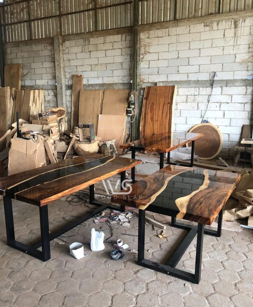 meja resin yang menyatukan dua kayu dengan resin di bagian tengah kayu sehingga membuat bentuk yang mengikuti alur serat kayu, gabungkan top meja ini dengan kursi makan kami untuk menambah kesan mewah pada ruang makan anda.