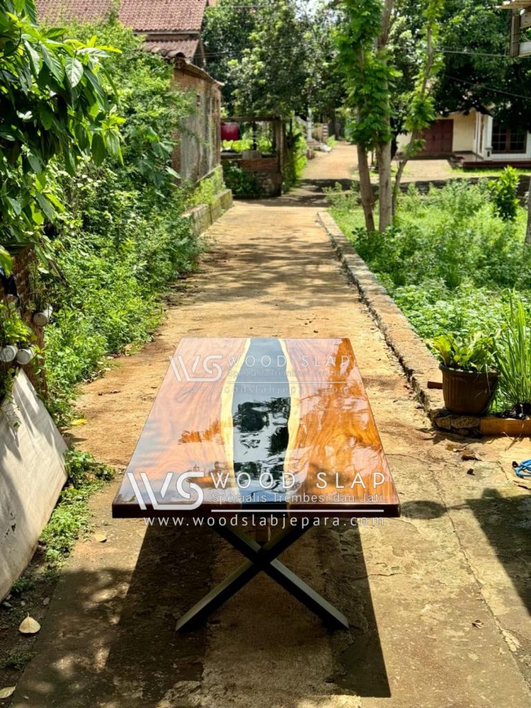 Meja Makan dengan sentuhan bahan resin epoxy pada bagian tengah meja membuat meja makan ini sangat rekomended untuk ruang makan dan taman anda dengan desain yang mengedepankan sisi natural pada bahan baku kayu trembesi (suar) yang sangat cocok untuk anda yang sangat menyukai desain natural klasik, sisi natural yang di padukan dengan modern pada kaki meja yang membuat meja ini sangat elegan dan mewah.