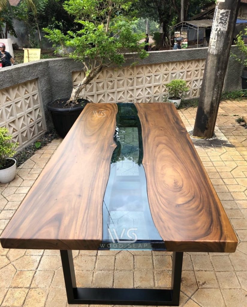 meja makan resin dengan aksen sungai pada tengah meja yang terbuat dari bahan resin epoxy transparan, perpaduan antara kayu trembesi solid dengan resin epoxy transparan membuat meja makan ini sangat cocok untuk mengisi ruang makan anda.