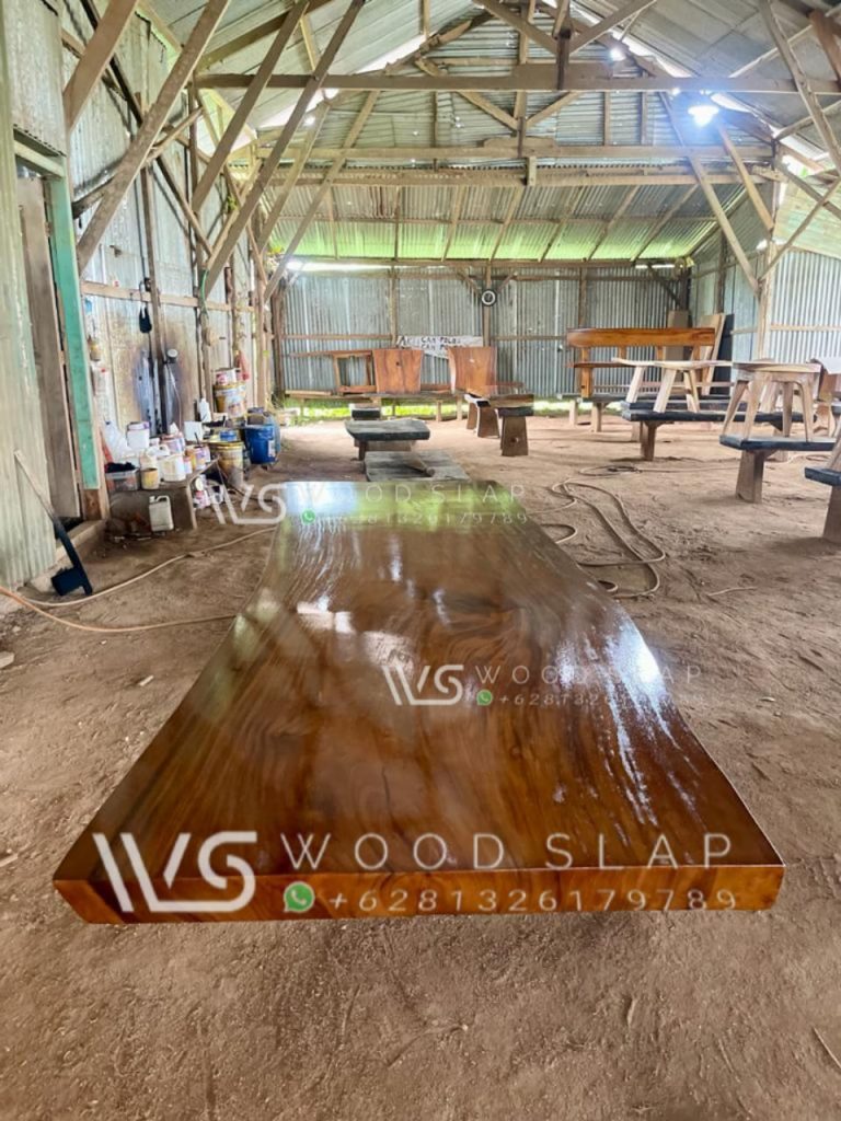 papan meja terbuat dari kayu trembesi solid tanpa sambungan dengan sisi meja alami, membuat meja ini terlihat begitu terlihat mewah dan elegant. kami rekomendasikan meja ini untuk mengisi ruang interior anda, meja ini merupakan produk dari katalog WOOD SLAP jepara.