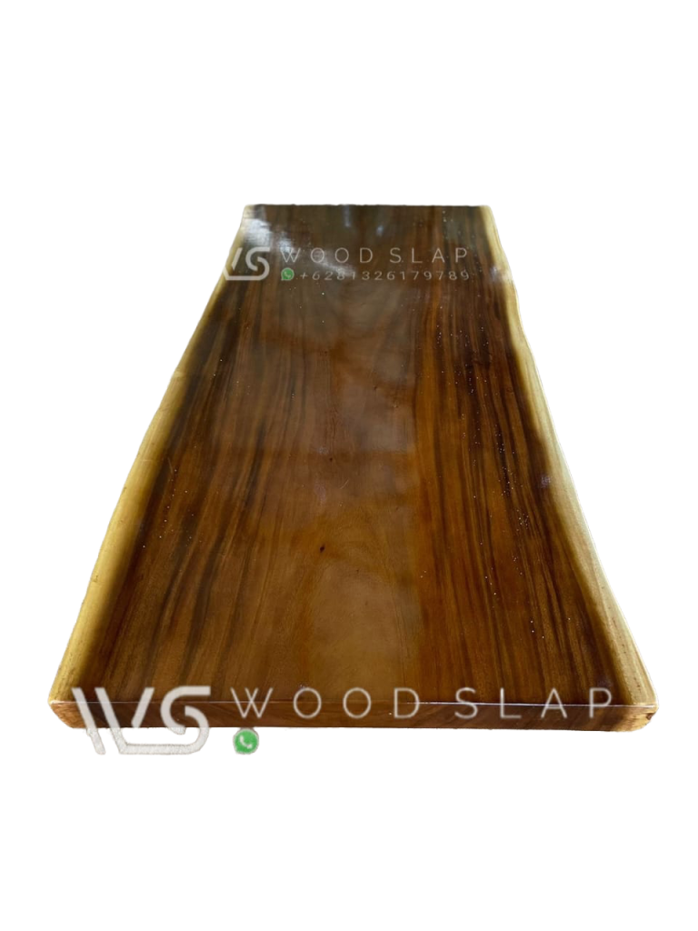 top meja dengan sisi alami menambah kesan elegan pada meja ini. terbuat dari kayu trembesi utuh dengan sentuhan finishing natural walnut gloss wash, membuat tampilan meja sangat pas untuk berada dalam ruangan anda untuk mengisi interior bergaya kalisk vintage.