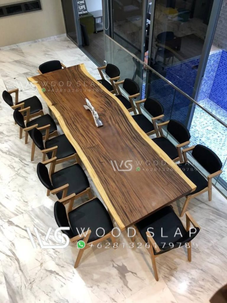 meja meeting berbahan kayu trembesi solid yang sangat cocok untuk ruang meeting atau anda gunakan untuk meja makan keluarga besar anda. kami menggunakan bahan kayu trembesi berkualitas yang di padukan dengan kaki meja yang berbahan galvanis yang membuat meja ini sangat terlihat mewah dan elegan. meja ini merupakan salah satu dari katalog terbaru WOOD SLAP Jepara.